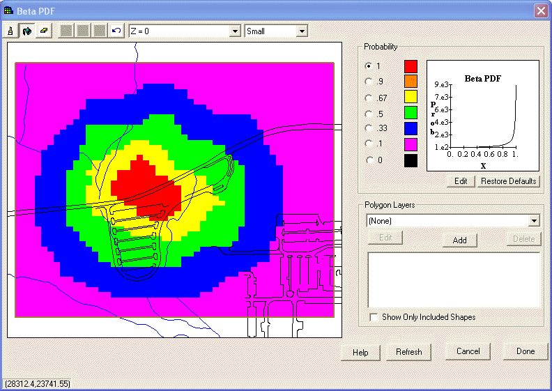 (Note: the graph on the far right displays the beta distribution associated with the selected probability.) Polygons may be used to further define the site, if applicable. Press Done when finished.