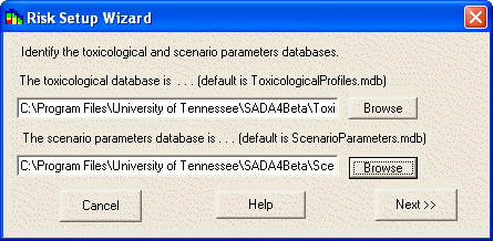 Select Yes. (Select No to cancel the setup process.) In the next window, SADA needs the names of the supporting toxicological profiles and scenario parameters databases. Type the name of the corresponding databases or press Browse to select.