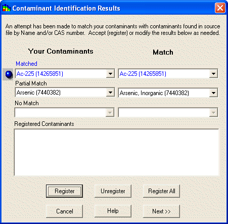 On the left side of the window, your contaminants have been divided into the three categories. To view a resulting match for any contaminant, click on the down arrow and select your contaminant from the resulting drop down list. The corresponding selection on the right hand side will change to show SADA’s match for your contaminant. If the match is acceptable, press the Register button. If all matches within a category are acceptable, press Register All. To unregister a matched pair(s), select the pair(s) in the registered contaminants box and press Unregister. Your contaminants will return to their original classification with their original match.